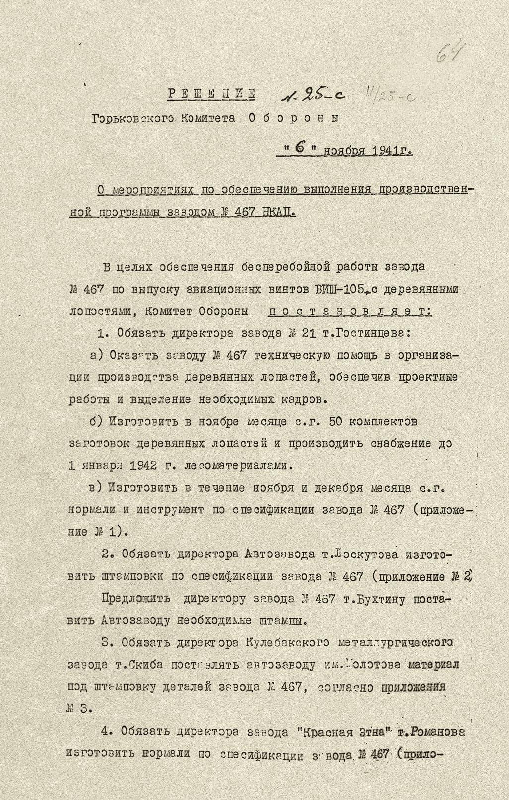 Ветераны той стройки вспоминали, что большую роль в судьбе предприятия сыграл А. И. Шахурин, побывавший на площадке в должности секретаря Горьковского обкома ВКП (б) в январе 1939 года. Через год он был назначен народным комиссаром авиационной промышленности СССР и, очевидно, инициировал передачу новостройки в свою отрасль. К тому моменту на территории нового завода полностью был готов только один корпус, и тот необходимо было реконструировать под новое производство, еще несколько цехов только завели под крышу, зато стройка была обеспечена коммуникациями. Сроки окончания работ были довольно жесткими: приказом наркома авиапрома №702 от 9 декабря 1940 года заводу был определен объект производства — воздушный винт изменяемого шага — с выпуском готовой продукции в третьем квартале 1941 года. Руководству завода (директором предприятия был А. И. Бухтин) предстояло менее чем за год достроить завод, наладить производство, набрать квалифицированных специалистов и поставить на поток выпуск важнейших комплектующих для самолетов.