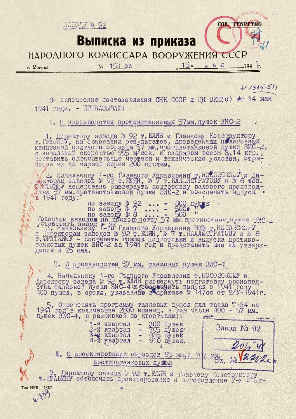 «Постановка на производство ЗИС-3 не только не обременит завод, но, наоборот, облегчит дело тем, что вместо двух пушек Ф-22 УСВ и ЗИС-2 в производство будет идти одна, но с двумя разными трубами ствола», — пояснял главный конструктор В.Г. Грабин. Но поначалу никто, кроме узкого круга посвященных, не знал, что на заводе № 92 собираются новые пушки. Единственную деталь, которая могла вызвать подозрение, — дульный тормоз — решили изготавливать в опытном цехе. Через некоторое время ЗИС-3 начали собирать уже больше, чем Ф-22 УСВ, и новость быстро распространилась. Это воодушевляло людей: вот как заводской коллектив выполняет свой долг перед Родиной!