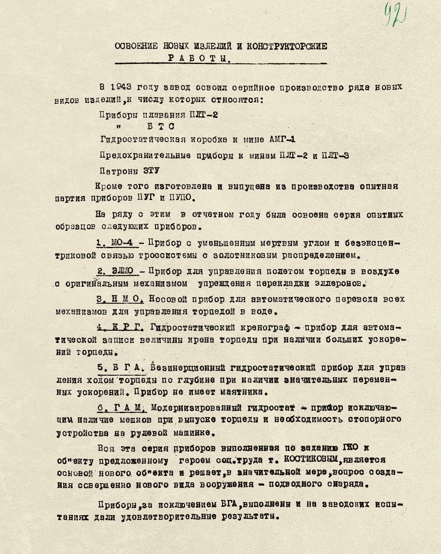 Наряду с плановыми работами выполнялось специальное задание по изготовлению таких приборов, как спидограф, гидрофон и стабилизатор глубины для торпед.