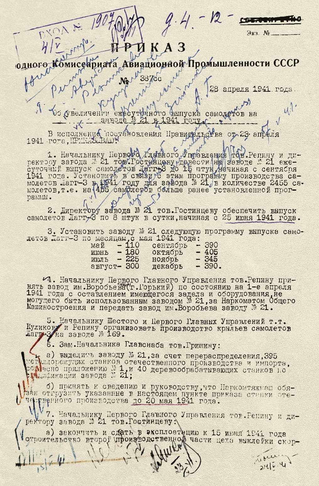 15 марта 1944 года ГКО приказал с мая начать выпуск нового истребителя без снижения достигнутого заводами темпа. То есть авиазавод №21 должен был выпускать 17 машин в сутки (еще три истребителя в сутки выпускал московский завод № 381). Историки отмечают, что это стало возможным только за счет роста производительности труда: новых площадей, станков и рабочей силы предприятия не получали.