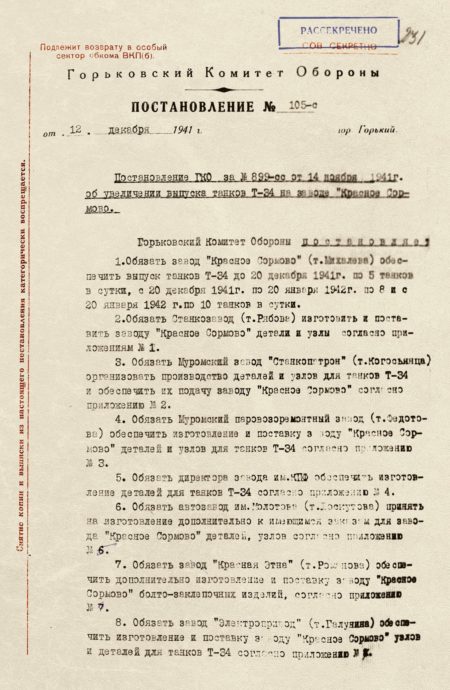С сентября по декабрь 1941 года завод передал фронту 173 танка. Чтобы снизить зависимость от заводов-смежников, которые поставляли комплектующие для Т-34, «Красное Сормово» самостоятельно стало изготавливать некоторые детали. В том числе в 1942 году предприятие стало выпускать траки — звенья гусеничной ленты, тем самым освободив от этой нагрузки Горьковский автозавод.