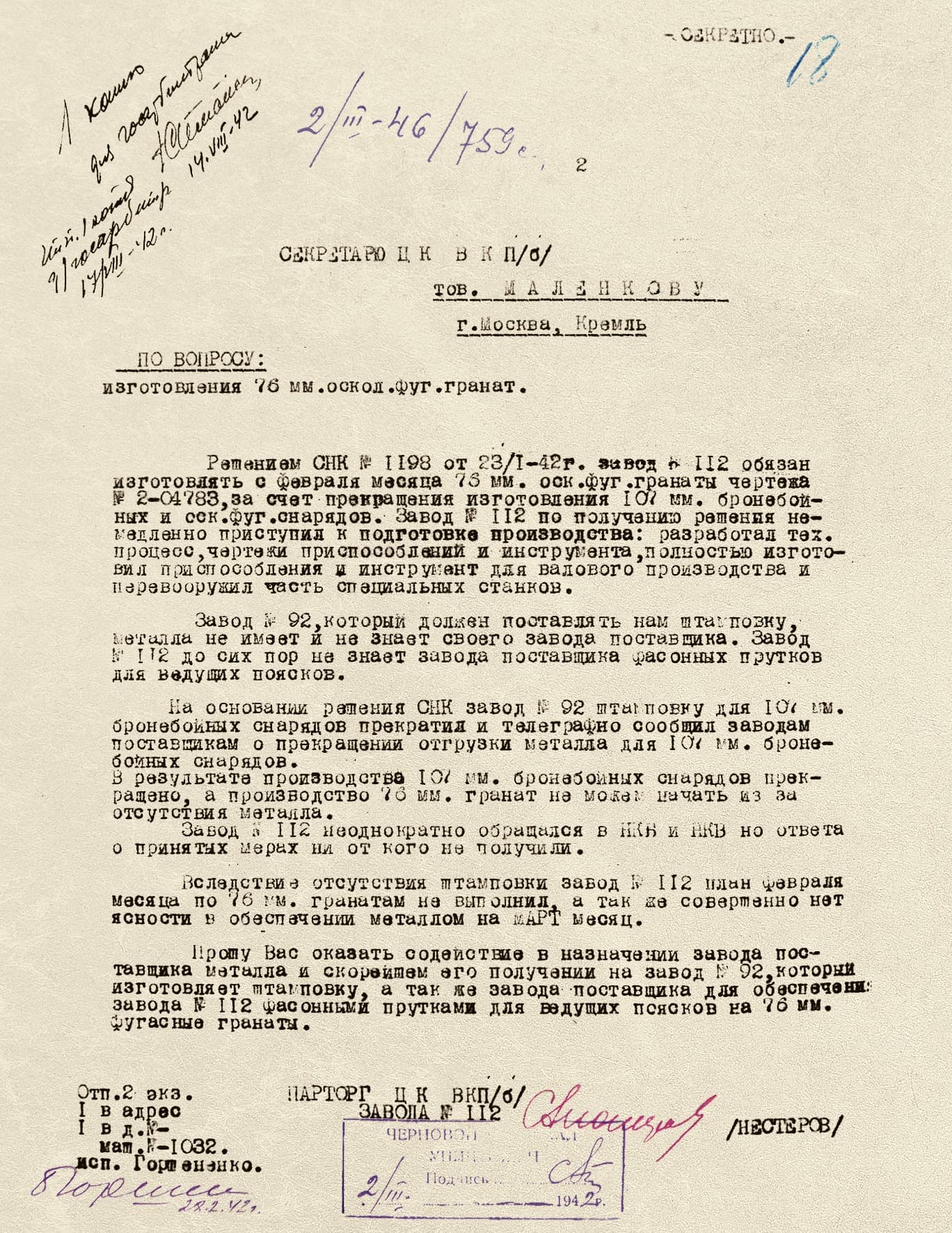Осенью 1941 года «Красное Сормово» приступило к производству крышки-сопла к снаряду М-8 и к отливке стальных головок для 250-кг фугасных авиационных бомб — ФАБ-250. С 1942 года на горьковском предприятии стали выпускать фугасные снаряды 76-мм, а производство боеприпасов 107-мм и 203-мм прекратилось. Заводу потребовалась перестройка — станки переоснащали силами самих рабочих.