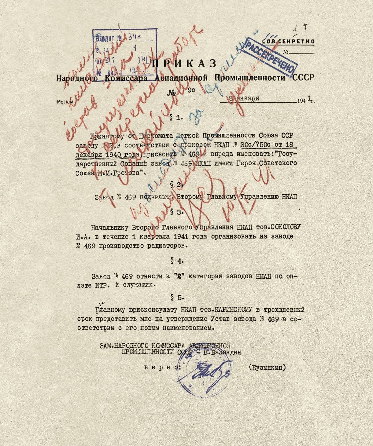 В конце 1940 года солнечногорская фабрика была передана в ведение Народного комиссариата авиационной промышленности СССР, заводу был присвоен № 469. В апреле 1941 года предприятие начало осваивать новое производство — выпуск радиаторов для авиационных двигателей. Свой опыт, приспособления, техническую документацию и чертежи на солнечногорский завод передавали специалисты московского завода № 34 (сейчас — ПАО «Научно-производственное объединение „Наука“»), на котором радиаторы для авиационной промышленности начали выпускаться с 1934 года.