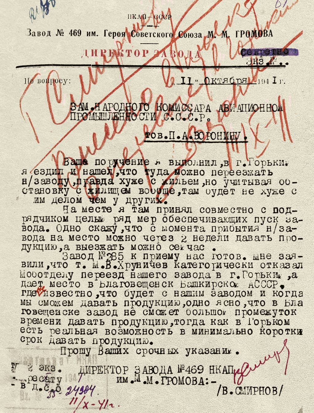 Директор завода В.Н. Смирнов посетил обе и по итогам поездки доложил заместителю наркома П.А. Воронину о том, что считает Горький оптимальным вариантом, — по его словам, там была «реальная возможность в минимально короткие сроки давать продукцию», тогда как в Благовещенске «неизвестно, что будет с нашим заводом».